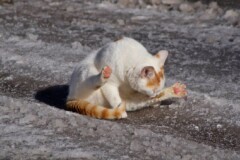 Dann kam ein gewaltiger Schock für mich… seine linke Hinterpfote war weg, nur noch Knochenreste, Blut, Krusten zu sehen. Tief durchatmen…er lebt und er frisst ! Sofort die TK Anif angerufen, ich soll morgen früh sofort kommen ( er ist ein Notfall ) und heute Abend noch Schmerzmittel und AB geben ( habe ja immer alles im Haus).