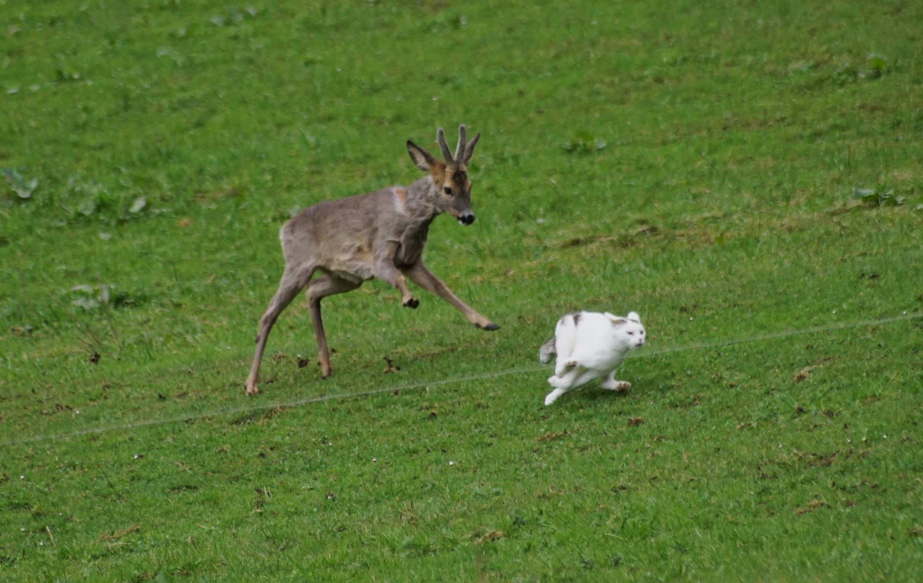 Stopp... Halt... es gibt etwas zu fressen! Er hat eine halbe Dose allein aufgefressen... mir zu liebe. Dann ist er wieder raus. Becci schaute ihn so komisch an.. Nasenstupser. Dann ging er zum Zaun … er wollte wieder zum Bach. Becci ging hinterher, da blieb er stehen. Es gab noch einmal einen Nasenstupser, es war der allerletzte gewesen. Sie ließ ihn allein gehen..sie wusste Bescheid. Er ist gegangen … er hat in diesem Moment den Zeitpunkt zum Gehen bestimmt. Noch ein letztes Mal drehte er sich um. Wir schauten ihm alle hinterher, dabei habe ich noch gehofft, dass er wieder kommt.
