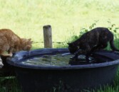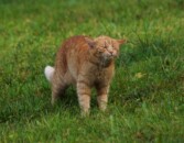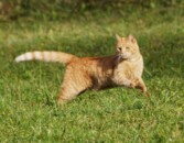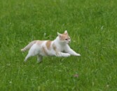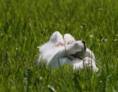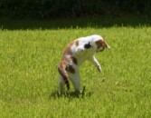 Man entführt die Spielzeugmaus in die Wiese... wirft sich dann auf den Rücken... und betet die Sonne an.